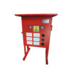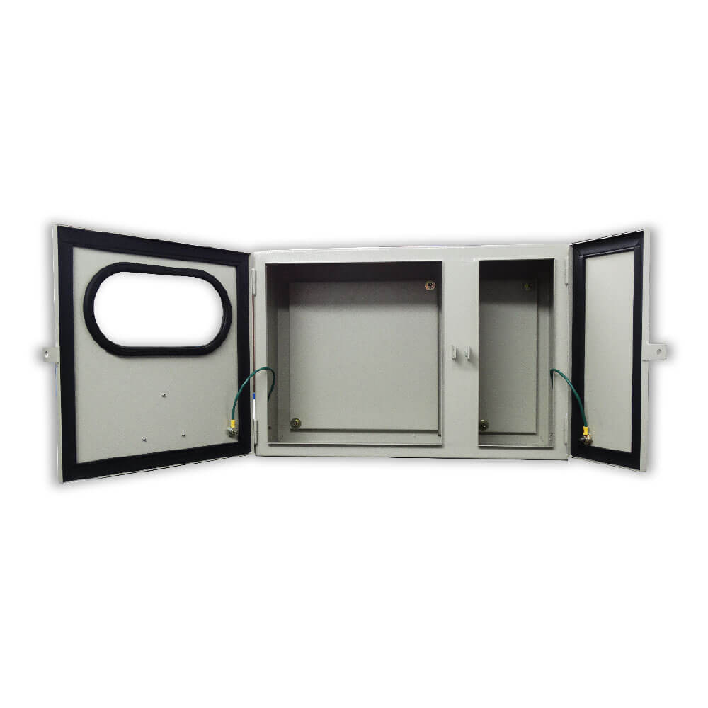 Fabricadas en lamina cold-rolled calibre 16 y/o 18 y acabado final en pintura en polvo horneable de aplicación electrostática, color beige duna (RAL 7032). Con puerta abisagrada, visor de vidrio para la lectura del medidor, un porta-candado para seguridad del equipo y Doble fondo metálico para fijación de equipos.